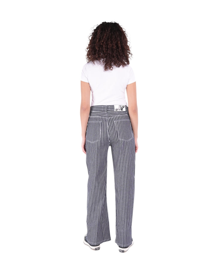 The Striped Lightweight Denim redefines volume and flow. Designed in a super baggy cut with a low-rise waist, this style is crafted from a lightweight striped cotton denim for enhanced drape and comfort. Detailed with silver Elusive hardware and a metal badge, it stands as a statement of individuality within the collection.