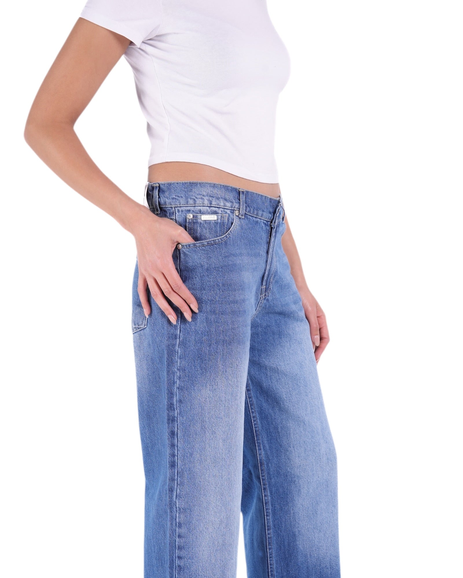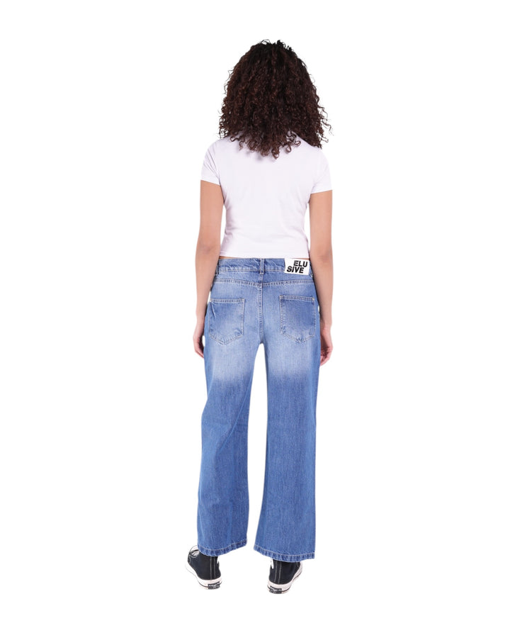Balanced and understated, the Mid Wash denim brings versatility to the forefront. Crafted from rigid 100% cotton, this wide-leg, low-rise fit combines clean lines with laid-back energy. Detailed with silver Elusive-branded hardware and a metal badge accent, it’s built for timeless wear and effortless styling.